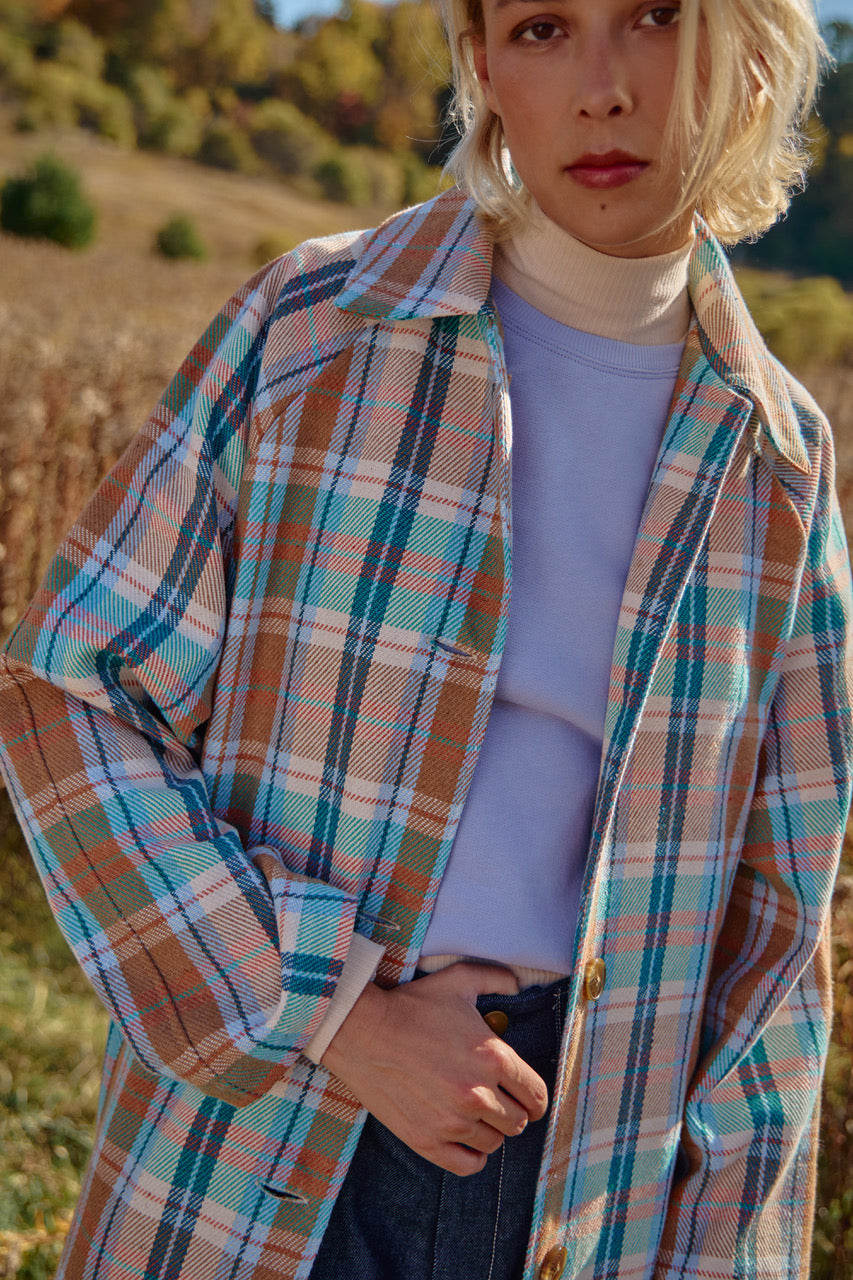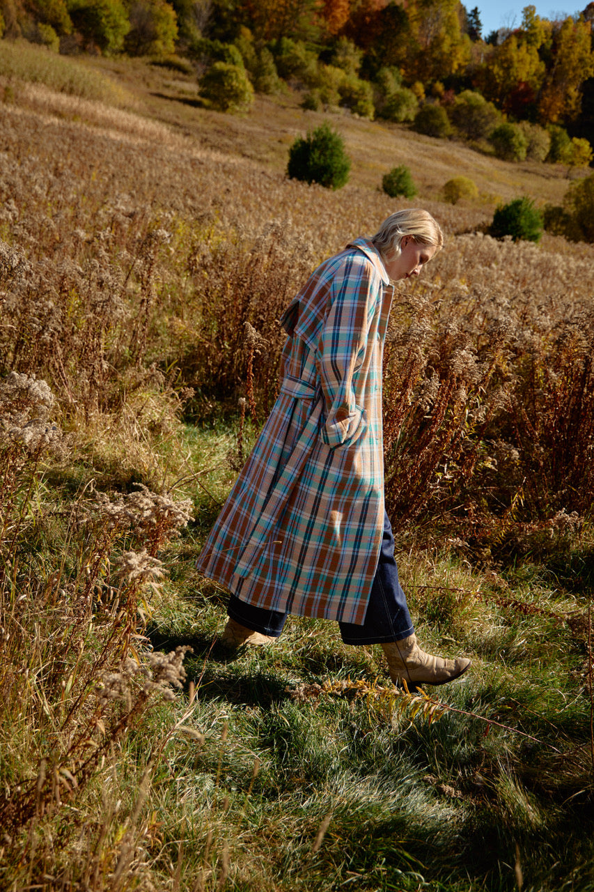 This beautiful trench coat is our "pièce de résistance" and that's why it's called EXTRA, because this is exactly how you will feel when wearing it.  Extra long, extra wide, made of a beautiful Plaid eco cotton blend twill from Brazil, giving it a soft but sturdy feel.  This statement piece will be a great addition to your wardrobe.