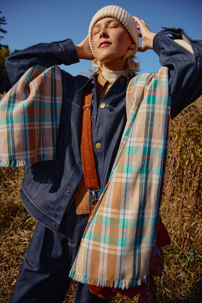 Le foulard DISPATCH est à carreaux avec un mélange coloré de bleu, orange, marron et crème. Il est fabriqué dans le même tissu que le trench EXTRA et se marie magnifiquement avec celui-ci, mais ajoute également une touche amusante à nos autres manteaux. Porter le DISPATCH, c'est comme porter une couverture autour du cou, et il vous gardera certainement bien au chaud.