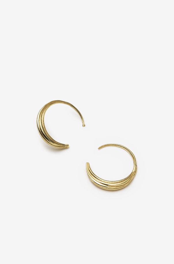 The Laura Earrings elevate the classic hoop into a contemporary, layered crescent with quiet sophistication. Soft ridges add dimension, catching light in a gentle play of line and shadow. Their warm, luminous finish brings effortless radiance, elevating any look with ease. Weightless and fluid, they bring a silken flow and confident elegance, leaving a warm trace of quiet luxury wherever they go.